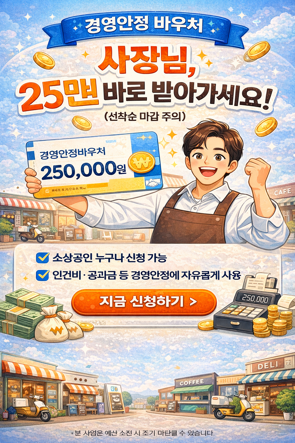 - 지원 혜택: 경영안정자금 및 전기료/배달료 등 최대 25만 원+@ 현금/바우처 지급
