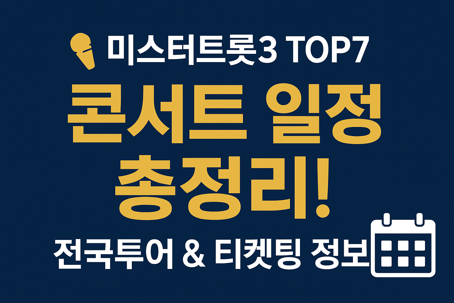 2025~2026 미스터트롯3 TOP7 전국투어 콘서트 일정·장소·티켓팅 날짜·가격 정보를 한눈에 정리했습니다. 부산·대구·용인·의정부·천안·광주 등 전국 공연 일정과 예매 팁까지 확인하세요.