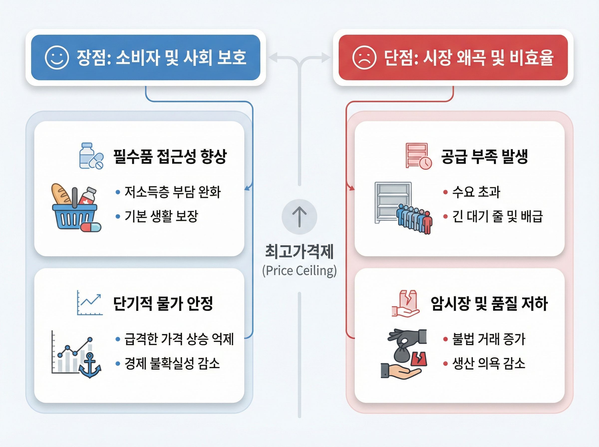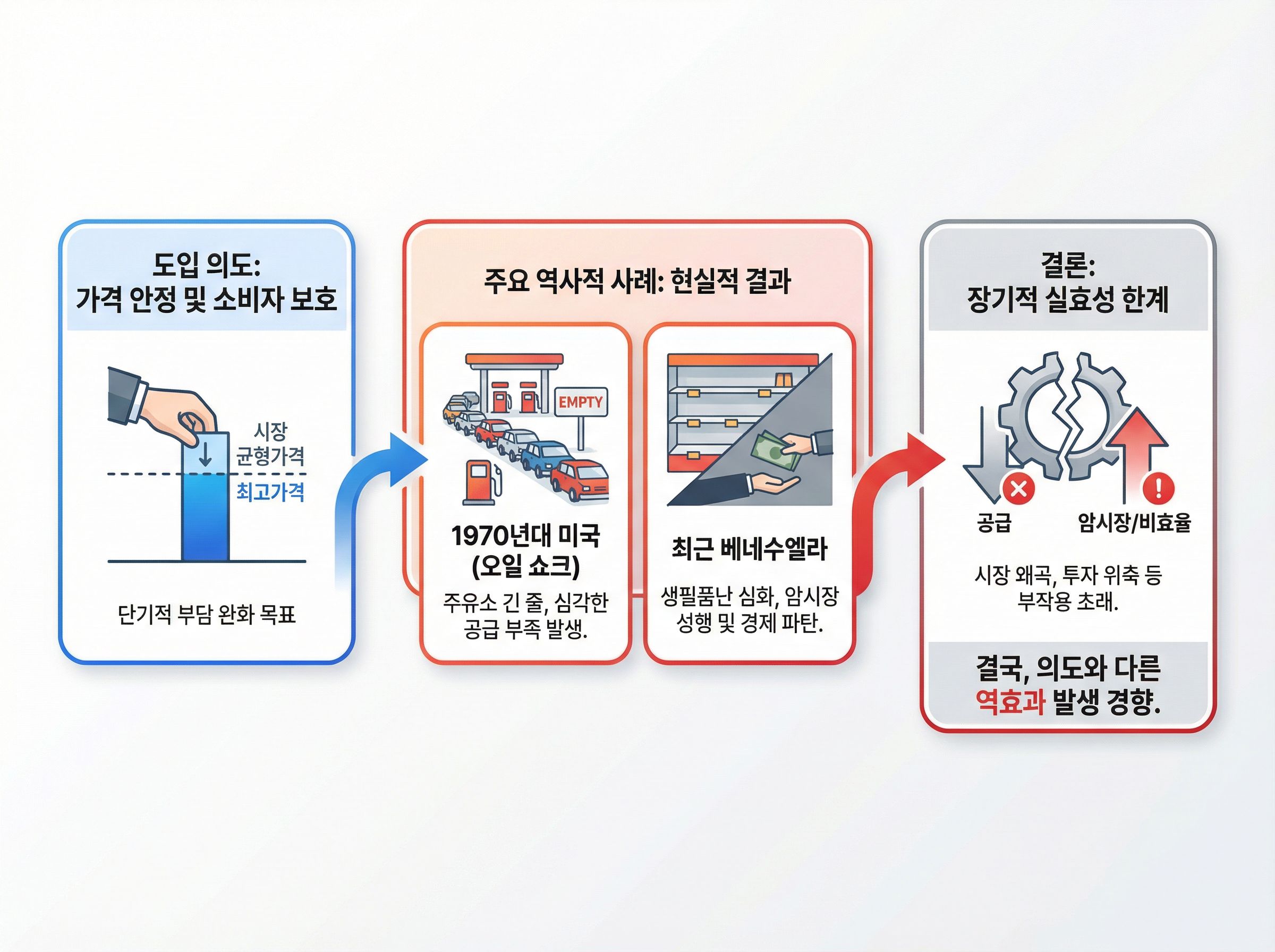 - 단기적인 서민 경제 보호에는 효과적이지만, 장기화될 경우 공급 부족, 품귀 현상, 암시장 형성 등 심각한 부작용을 초래합니다.