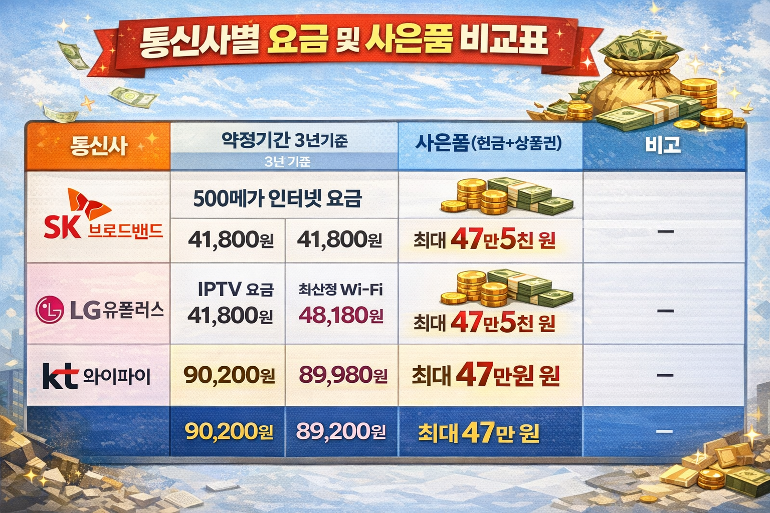 1. 경품고시제 준수: 법적 한도인 최대 47만 원(인터넷+TV 기준)을 꽉 채워주는지 확인하세요. 이보다 터무니없이 많이 준다는 곳은 사기일 확률이 높습니다.