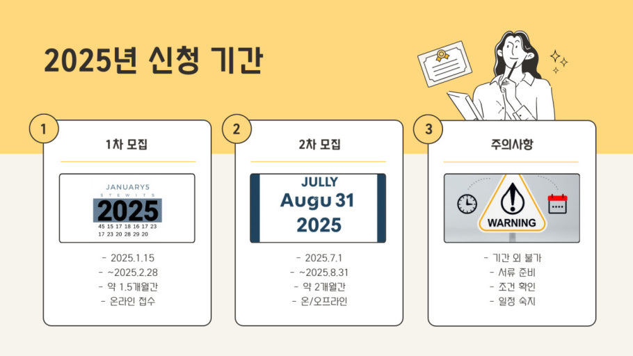 청년수당 지원사업은 매년 공고를 통해 신청 기간이 고시되며, 일반적으로 상반기(3~4월)와 하반기(9~10월) 2회 접수를 진행합니다. 사업 시작일은 지자체별로 다르지만, 대부분 공고 후 1개월 내 첫 지급이 이루어집니다.