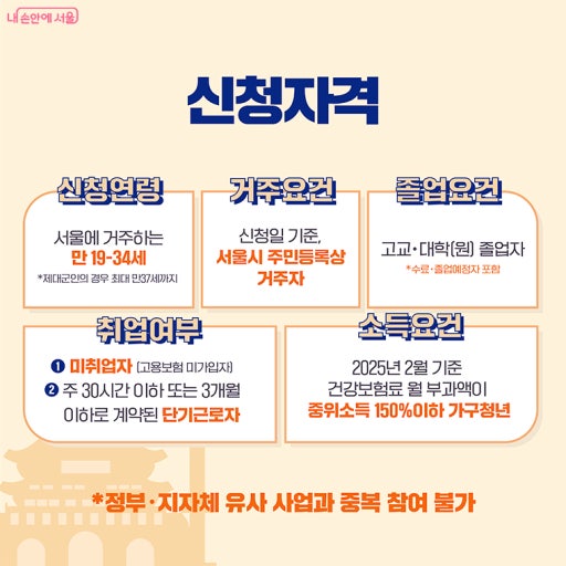 신청 대상은 만 19세 이상 34세 이하 국내 거주 청년 중 재학생이 아니며, 고용보험 미가입 상태이거나 취업 준비생, 창업 준비생 등입니다. 소득 기준은 중위소득 150% 이하로, 가구원 합산 소득이 일정 기준 이하여야 합니다. 기초생활수급자 또는 차상위계층은 자동 우대되며, 다만 동일 지원 사업 중복 참여자는 제외됩니다.