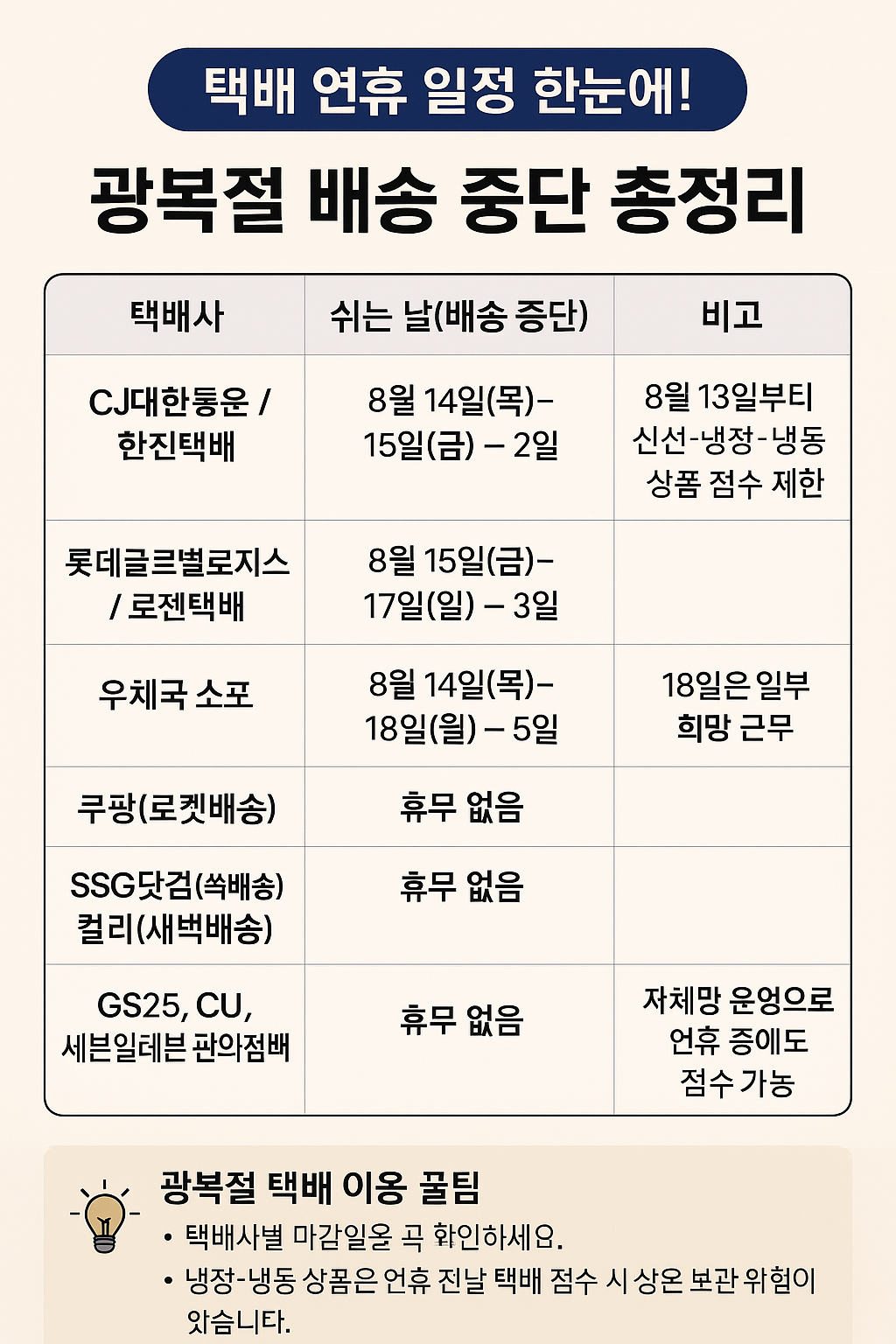 📌 2025년 광복절(8월 15일) 주요 택배업체 ‘택배 쉬는 날’ 총정리