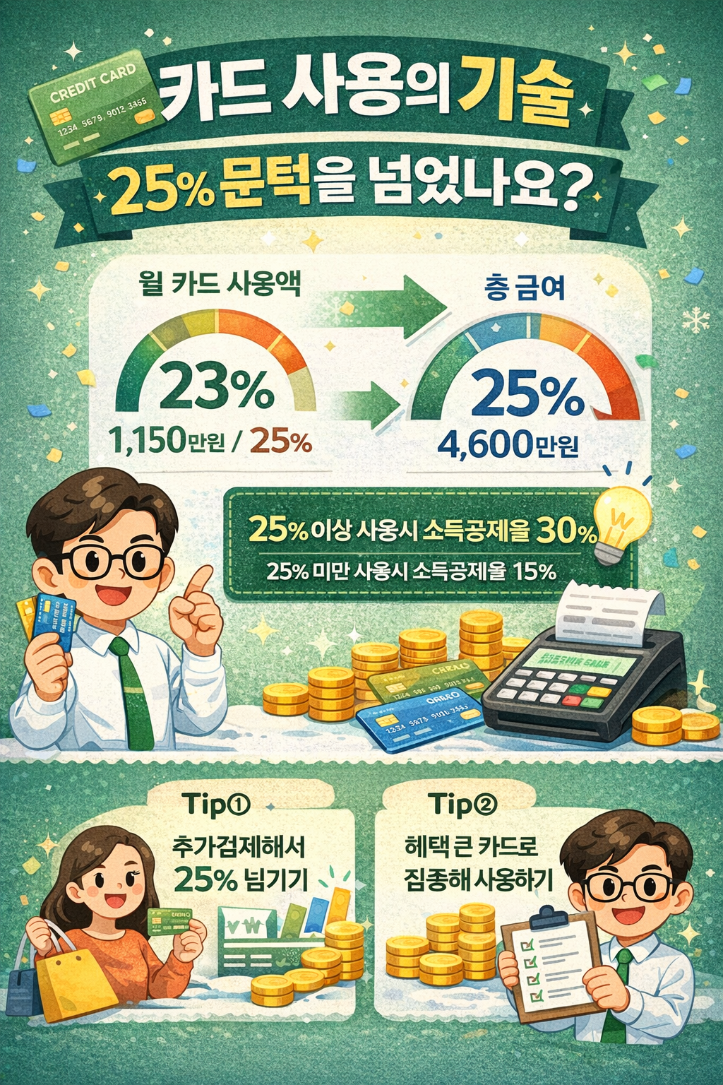 - 문턱 후(25% 초과): 공제율이 2배인 체크카드와 현금영수증 집중 사용