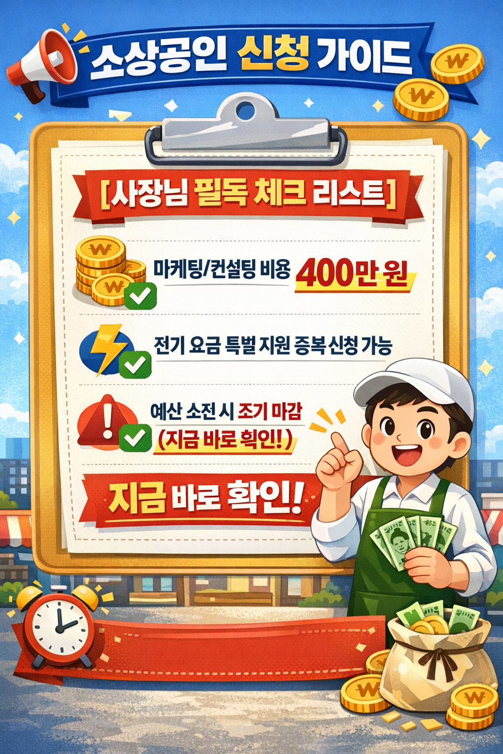 - 에너지 비용 지원 (별도 신청): 영세 소상공인을 위한 '전기요금 특별지원' 바우처는 한전 전기요금 고지서에서 자동으로 차감되거나 계좌로 환급되는 방식입니다. (연 매출 6,000만 원 이하 등 별도 기준 적용)