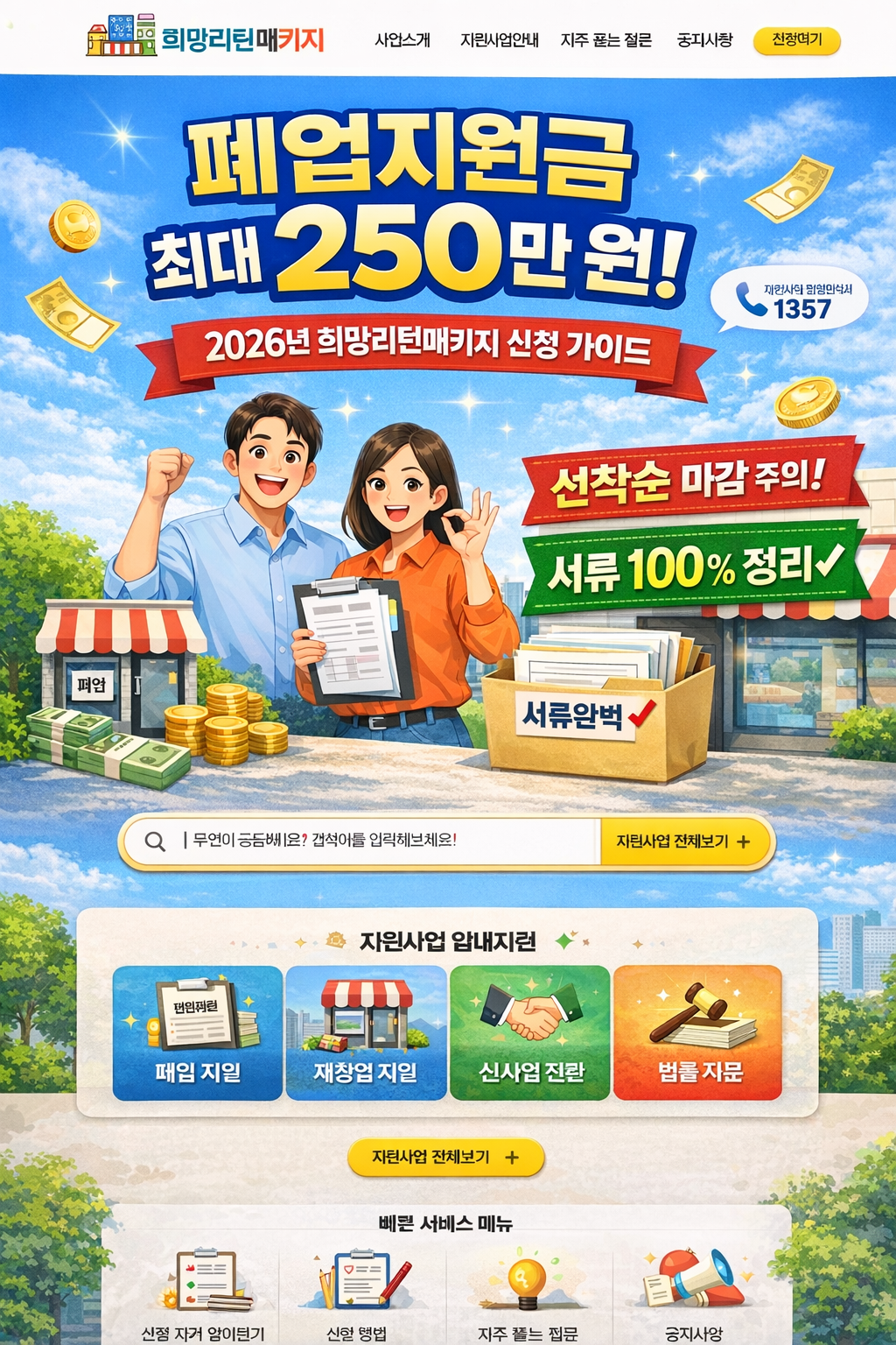 "2026년 소상공인 폐업지원금 최대 250만 원 받는 방법 완벽 정리. 희망리턴패키지 점포 철거비 신청 자격, 서류, 소상공인 재기지원 절차까지 한눈에 확인하세요."