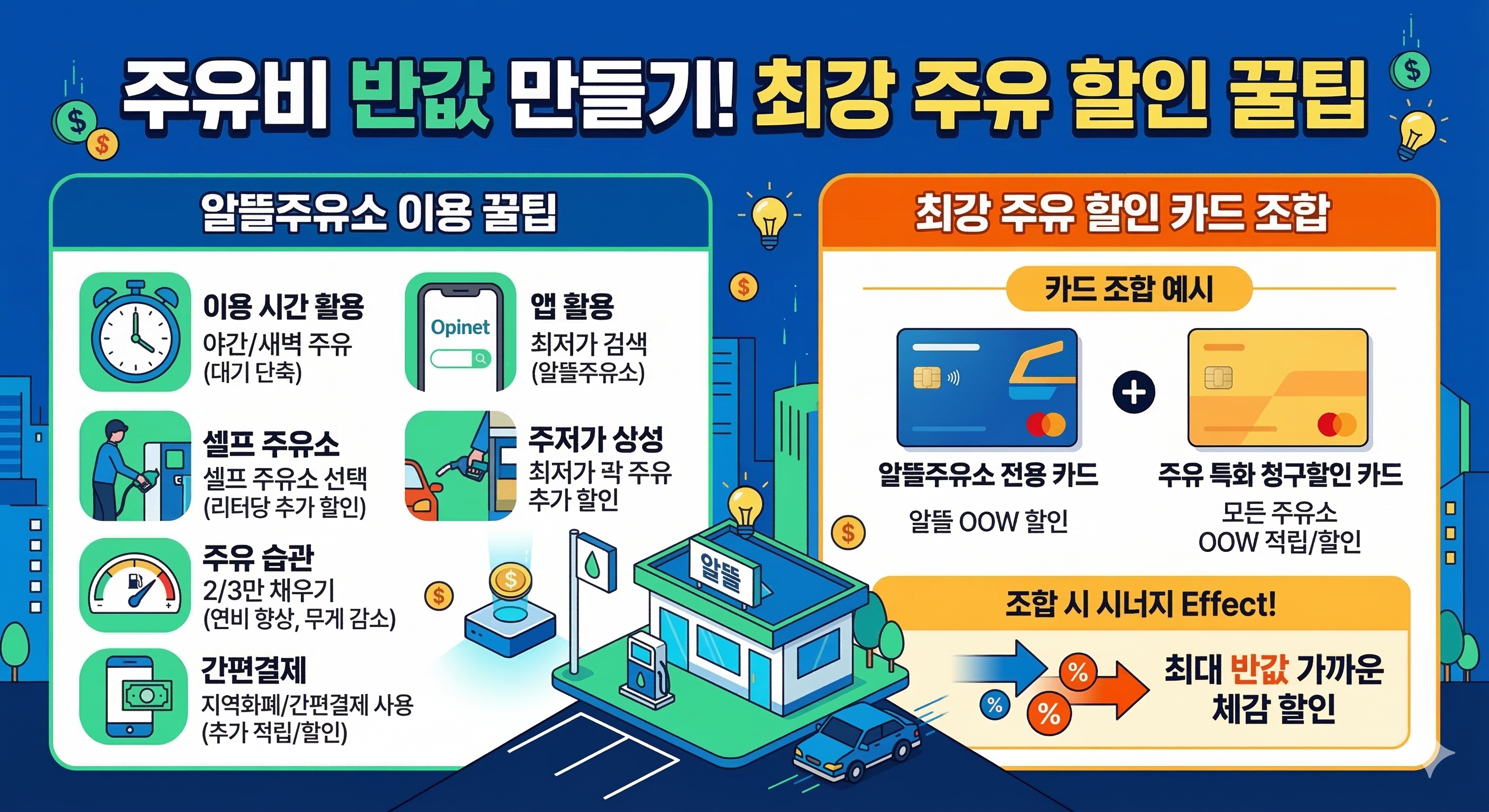 - 알뜰주유소에서도 주유 특화 신용카드 및 지역화폐 할인이 100% 적용되므로 조합 시 체감 주유비가 극적으로 낮아집니다.