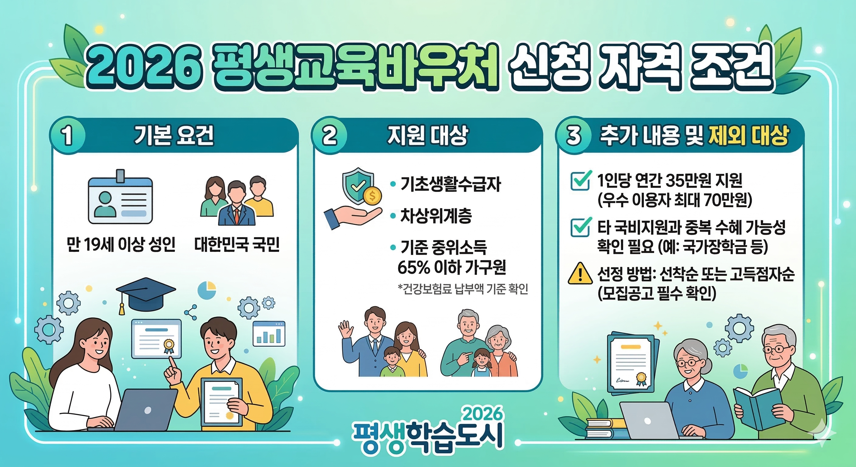 2026년 평생교육바우처(평생교육이용권)는 경제적인 이유로 교육의 기회를 놓치지 않도록 국가에서 지원하는 든든한 제도입니다. 하지만 안타깝게도 모든 국민이 받을 수 있는 것은 아니며, 특정 소득 기준을 충족해야 합니다.